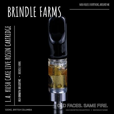 When purchasing Brindle Farms’ LA Kush Cake Live Rosin Cartridges, you can expect to receive a light golden coloured, clear, uniform, and stable solventless hash oil inside.