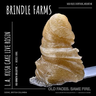 Bred by J. Beezy from Seed Junky Genetics, LA Kush cake is a cross between Wedding Cake and Kush Mints, with the latter being the male. Our chosen phenotype is indica dominant, with a classic powerful OG kush flavor, with earthy, gas and diesel flavor, backed up with a subtle sour vanilla and coffee bean. True to its name, the plants yield large dense flowers caked in crystal, poised for extraction. Its OG influence results in a long stretch phase and tall lanky plants that require much support and attention. LA Kush Cake yields some of the most potent resin grown at Brindle Farms, resulting in a hash rosin that is not for beginners. Its heavy onset and long lasting body high are delivered through strong flavor due to its high terpene content. The flavor profile represents what hard hitting Kush is all about...the gas. It provides a very sedative, euphoric and relaxing experience.